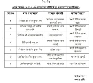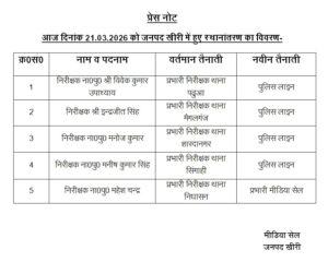 इंस्पेक्टर विवेक कुमार उपाध्याय प्रभारी निरीक्षक थाना पढ़ुआ से पुलिस लाइन, इंस्पेक्टर इन्द्रजीत सिंह प्रभारी निरीक्षक थाना मैगलगंज से पुलिस लाइन, इंस्पेक्टर मनोज कुमार प्रभारी निरीक्षक थाना शारदानगर से पुलिस लाइन, इंस्पेक्टर मनीष कुमार सिंह प्रभारी निरीक्षक थाना सिंगाही से पुलिस लाइन, इंस्पेक्टर महेश चंद प्रभारी निरीक्षक थाना निघासन से प्रभारी मीडिया सेल, इंस्पेक्टर दिनेश कुमार शर्मा निरीक्षक अपराध थाना कोतवाली सदर से प्रभारी निरीक्षक थाना पढुआ, इंस्पेक्टर दिलीप कुमार चौबे प्रभारी निरीक्षक थाना फरधान से प्रभारी निरीक्षक थाना सिंगाही, इंस्पेक्टर अवधराज सिंह सेंगर थाना साइबर सेल से प्रभारी निरीक्षक थाना निघासन, इंस्पेक्टर राजू राव प्रभारी निरीक्षक थाना मझगई से प्रभारी निरीक्षक थाना फरधान, इंस्पेक्टर संजीव कुमार सिंह पुलिस लाइन से प्रभारी निरीक्षक थाना मैगलगंज, सब इंस्पेक्टर अनिल कुमार पंकज चौकी प्रभारी खजुरिया से थानाध्यक्ष मझगई व सब इंस्पेक्टर बृजमोहन बनमाली थाना कोतवाली सदर से थानाध्यक्ष शारदानगर बनाए गए।